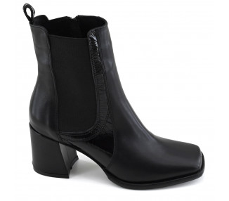 Botineta de cuero combinado con charol. Caña media ceñida, con cierre lateral interno y lateral externo con pieza elastizada. Fondo el suela y taco forrado.