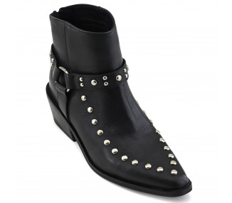 Botineta de estilo texana confeccionada en cuero. Caña media baja ceñida con cierre trasero. Detalle de tachas sobre capellada y en estribo. Fondo en suela con taco foliado de base sintética.