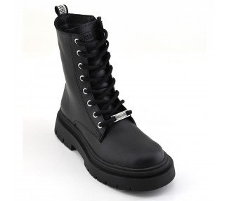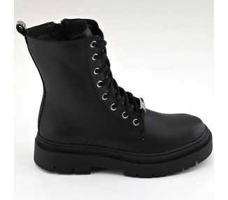 Bota estilo borcego en cuero graneado. Caña media baja con cierre lateral y detalle de cintos con hebillas. Plataforma sintética.