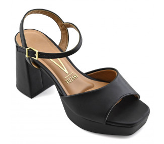 Sandalia de una faja con taco. Material sintético. Acceso y ajuste mediante tiras pulsera con hebilla. Plataforma y taco flare forrado con base sintética.