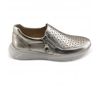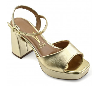 Sandalia metalizada con talonera. Suela sintética y taco forrado.