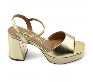 Sandalia metalizada de talón descubierto. Material: sintético. Plataforma y taco flare forrado con base sintética.