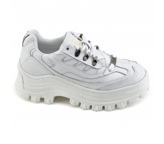 Fabricada en cuero vacuno y tela antidesgarro. Acordonada con ojalillos alpinos. Plantilla de latex y robusta suela plataforma de goma. Altura: 4 cm en plataforma y 5 cm en área de talón.