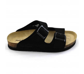 Sandalia de gamuza y tiras con strass. Acceso y ajuste con hebilla en pulsera. Taco vainilla forrado y suela.