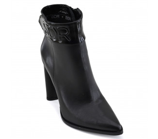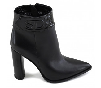 Bota confeccionada en cuero vacuno. La caña presenta una faja en cuero charol con grabado de marca SDR. Acceso por cierre interno. Suela vacuno y taco forrado a tono. Medidas: taco 11 cm de altura.