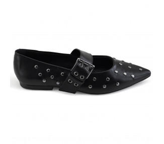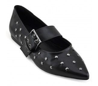 Zapato chato en material sintético. Detalle de tachas en capellada y cinto con hebilla regulable. Terminación en punta y taco chato. Base inyectada.