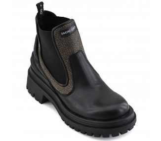 Bota estilo borcego en cuero graneado. Caña media alta con dos cierres metálicos en frente y cinto regulable con abrojo. Base plataforma sintética con taco.