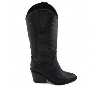 Texana de cuero liso con recorte superpuesto y dibujo bordado. Caña de acceso amplio con orejas de sujeción y cierre bajo en lateral interno. Suela con taco foliado y suelín sintético. Material: 100% Cuero / Taco: 5 cm / Caña: 27 cm.
