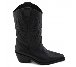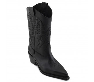 Bota estilo texana en cuero graneado con diseño bordado. Caña corta con aberturas laterales. Fondo en suela con taco foliado.