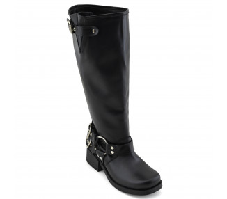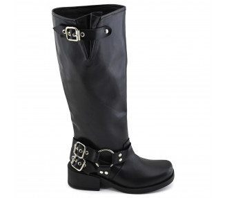 Texana de cuero liso con recorte superpuesto y dibujo bordado. Caña de acceso amplio con orejas de sujeción y cierre bajo en lateral interno. Suela con taco foliado y suelín sintético. Material: 100% Cuero / Taco: 5 cm / Caña: 27 cm.