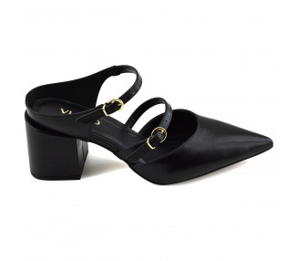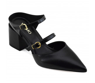 Zapato de cuero con tiras cruzadas y hebillas doradas. Diseño elegante con base firme. Confeccionado en cuero vacuno base inyectada, forrada en el mismo material, este modelo combina estilo y calidad en cada detalle. Su punta estiliza el pie, mientras que las tiras cruzadas con hebillas metálicas aportan sujeción y un aire sofisticado. El taco ancho asegura una pisada cómoda y estable. Horma...
