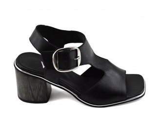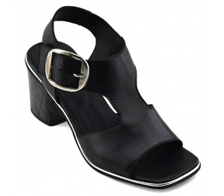 Sandalia de cuero con pulsera. Capellada de una pieza y pulsera ancha con hebilla. Suela con taco medio alto y suelín de goma.