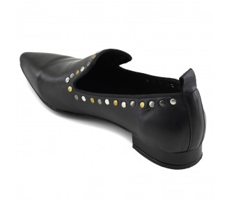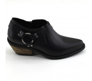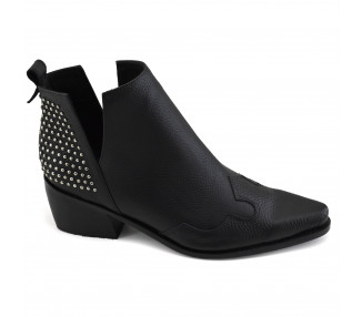 Confeccionada en cuero. Altura del taco: 4,5 cm. Peso aproximado: 800 gr. Detalle de tachas en talón.