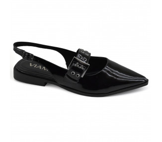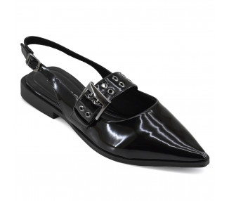 Zapato de charol con detalle de cinto con hebilla sobre empeine. Acceso y ajuste mediante tira con hebilla en talón.