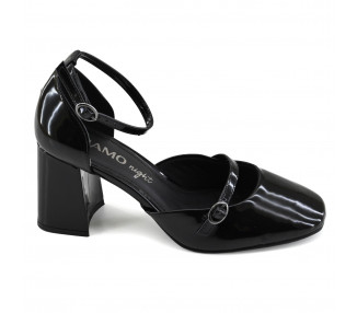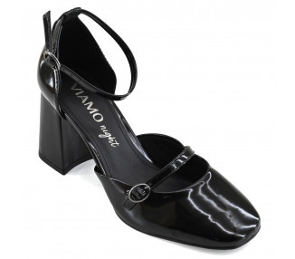Zapato de charol sintético. Puntera cerrada y detalle de cinto con hebilla. Talonera con pulsera y hebilla. Base inyectada con taco forrado a tono.