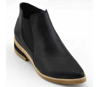 Borcego elastizado de cuero liso. Caña media baja con acceso elastizado en laterales. Fondo en plataforma dentada sintética.