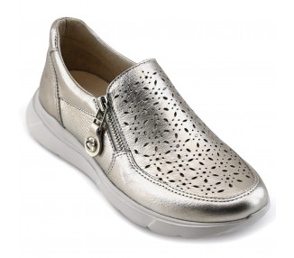 Sandalia metalizada con talonera. Suela sintética y taco forrado.