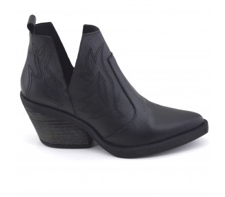Bota estilo texana en cuero graneado con diseño bordado. Caña corta con aberturas laterales. Fondo en suela con taco foliado.