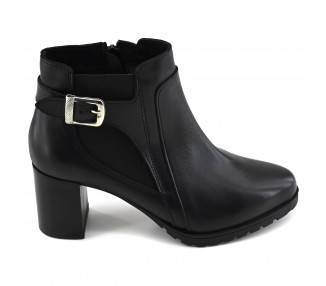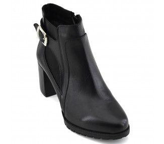 Botineta de cuero con cinto y hebilla. Acceso con cierre y pieza elastizada. Fondo con taco medio alto y base sintética.