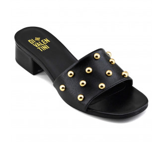Sandalia tipo zueco de faja amplia con apliques de tachas. Realizada en material sintético. Fondo con taco cuadrado forrado y suela sintética.