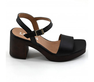Sandalia de cuero con plataforma alta estilo taco chino. Plataforma con diseño tejido.