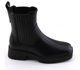Bota borcego de cuero liso. Caña media con cierre lateral y detalle de medios cintos con hebilla. Suela plataforma sintética.