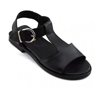 Sandalia de cuero y plataforma. Capellada con una faja y tira pulsera con hebilla. Plataforma delantera baja y taco alto forrado. Material de fondo: suela.