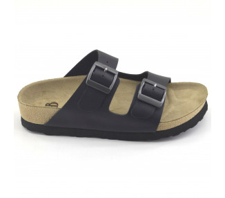 Sandalia birk en cuero con doble faja con hebillas. Plantilla en gamuza y suela plataforma con base de goma.