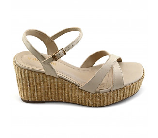 Sandalia metalizada de vinílico con tiras cruzadas. Fondo en plataforma góndola o taco chino forrado en fibra trenzada. Suela sintética con dibujo.