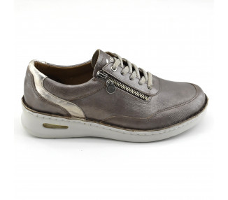 Botineta de cuero de mujer. Capellada de cuero con detalles metalizado y texturado en áreas de caña y talón. Sistema de cordones y cierre lateral. Base con plataforma y sutil elevación en altura.