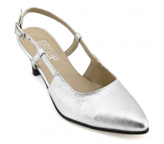 Zapato estilo ballerina en cuero texturado metalizado. Detalle tiras finas con apliques en formato de moños. Ajuste de tiras sobre empeine mediante hebillas laterales. Suela sintética con taco chato forrado y suelín sintético.