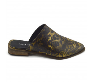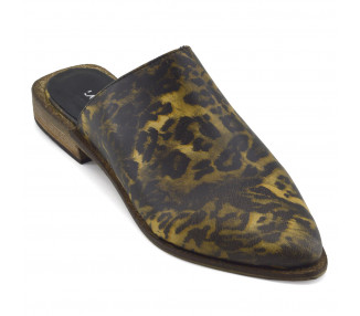 Mules confeccionado en cuero recubierto en glitter. Base de cuero Flex rústica con taco de 2 cm de altura. Se sugiere llevar un talle más que el habitual.