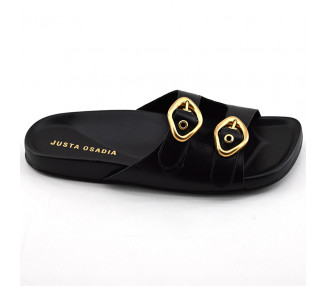 Zapato de cuero con tiras cruzadas y hebillas doradas. Diseño elegante con base firme. Confeccionado en cuero vacuno base inyectada, forrada en el mismo material, este modelo combina estilo y calidad en cada detalle. Su punta estiliza el pie, mientras que las tiras cruzadas con hebillas metálicas aportan sujeción y un aire sofisticado. El taco ancho asegura una pisada cómoda y estable. Horma...