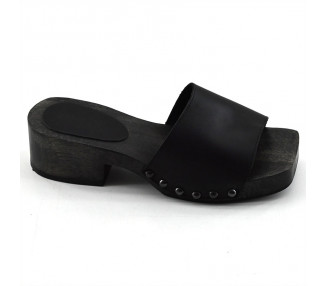Zueco confeccionado en madera resistente, su suela antideslizante garantiza seguridad en cada paso. Los detalles de clavos metálicos realzan su estilo sofisticado, aportando un toque moderno y exclusivo. Ideal para quienes buscan confort sin perder distinción.