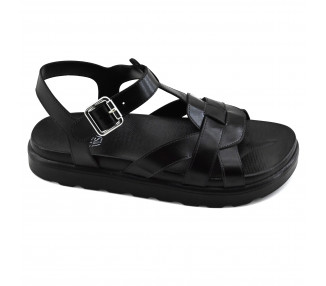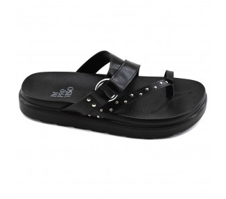 Sandalia de cuero sintético con plataforma. Minimalismo con altura. Esta sandalia está confeccionada en cuero sintético, con base inyectada liviana y plataforma cuña que estiliza sin resignar comodidad. Su diseño de capellada ancha cubre el empeine para un calce firme y cómodo.