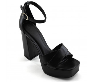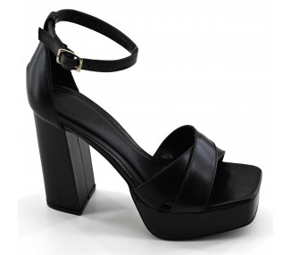 Sandalia de puntera y taco cuadrados. Talonera y tira pulsera con hebilla. Base en suela sintética con taco alto forrado de base cuadrada.