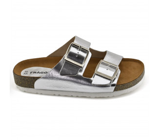 Sandalia birk de doble faja con hebilla. Capellada de cuero metalizado. Plantilla de gamuza y suela plataforma con base de goma.