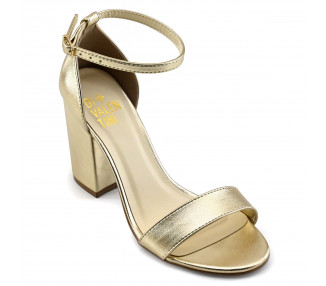 Sandalia metalizada con talonera. Suela sintética y taco forrado.