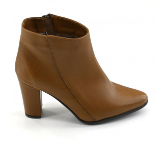 Botineta de cuero liso y caña corta con acceso por cierre lateral. Base sintética y taco forrado.