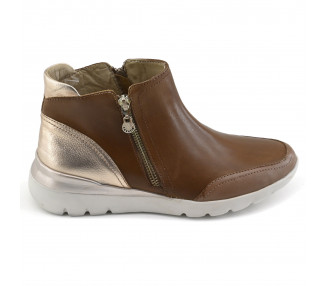 Botineta urbana de cuero liso combinado con metalizado. Caña corta y acceso con cierres laterales. Suela plataforma sintética ultra liviana.