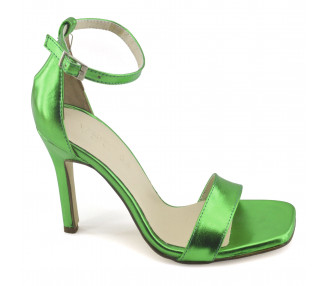 Sandalia de cuero metalizado. Puntera cuadrada y talonera con tira pulsera con hebilla. Taco aguja forrado y suela.