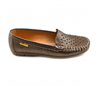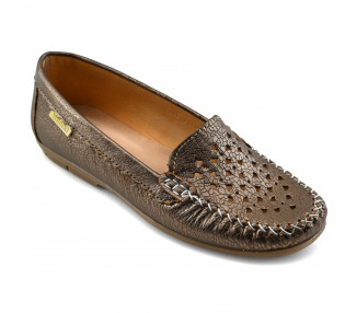 MocasÃn de mujer de cuero quebrado metalizado. Capellada con diseño calado y costuras vistosas. Fondo sintético.