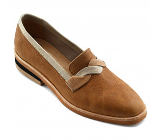 Mocasín de cuero graneado con detalle de aplique y guarda en contraste. Suela tricolor en eva con taco bajo.