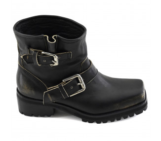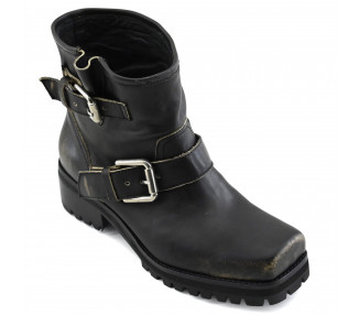 Borcego de cuero gastado y punta cuadrada con recortes. Detalle de cinturón con hebilla en capellada. Base TR de goma y madera. Taco folia de 5 cm.
