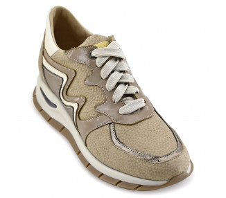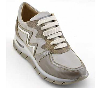 Botineta bicolor en cuero charolado. Detalle de costuras y puntera a contratono. Caña media baja ceñida con cierre lateral en lado interior. Suela sintética con taco fino.