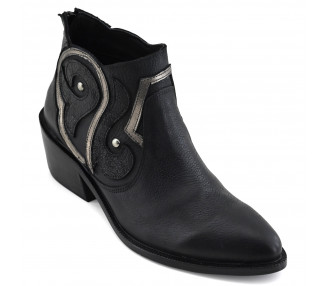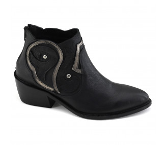 Botineta de cuero combinado con metalizado. Caña baja con cierre trasero. Suela con taco folia.