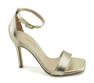 Sandalia de cuero metalizado. Puntera cuadrada y talonera con tira pulsera con hebilla. Taco aguja forrado y suela.