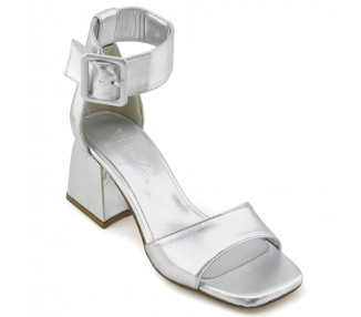 Sandalia de cuero metalizado. Puntera cuadrada y talonera con tira pulsera con hebilla. Taco aguja forrado y suela.