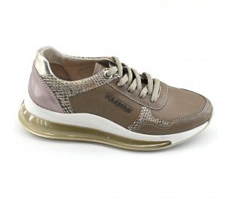 Bota de mujer en cuero. Caña baja con laterales elastizados. Cintos con ojales y hebillas. Suela plataforma de goma, con taco.