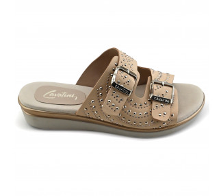 Zueco de cuero con detalle de tachas y hebillas. Plantilla cómoda y suela plataforma.